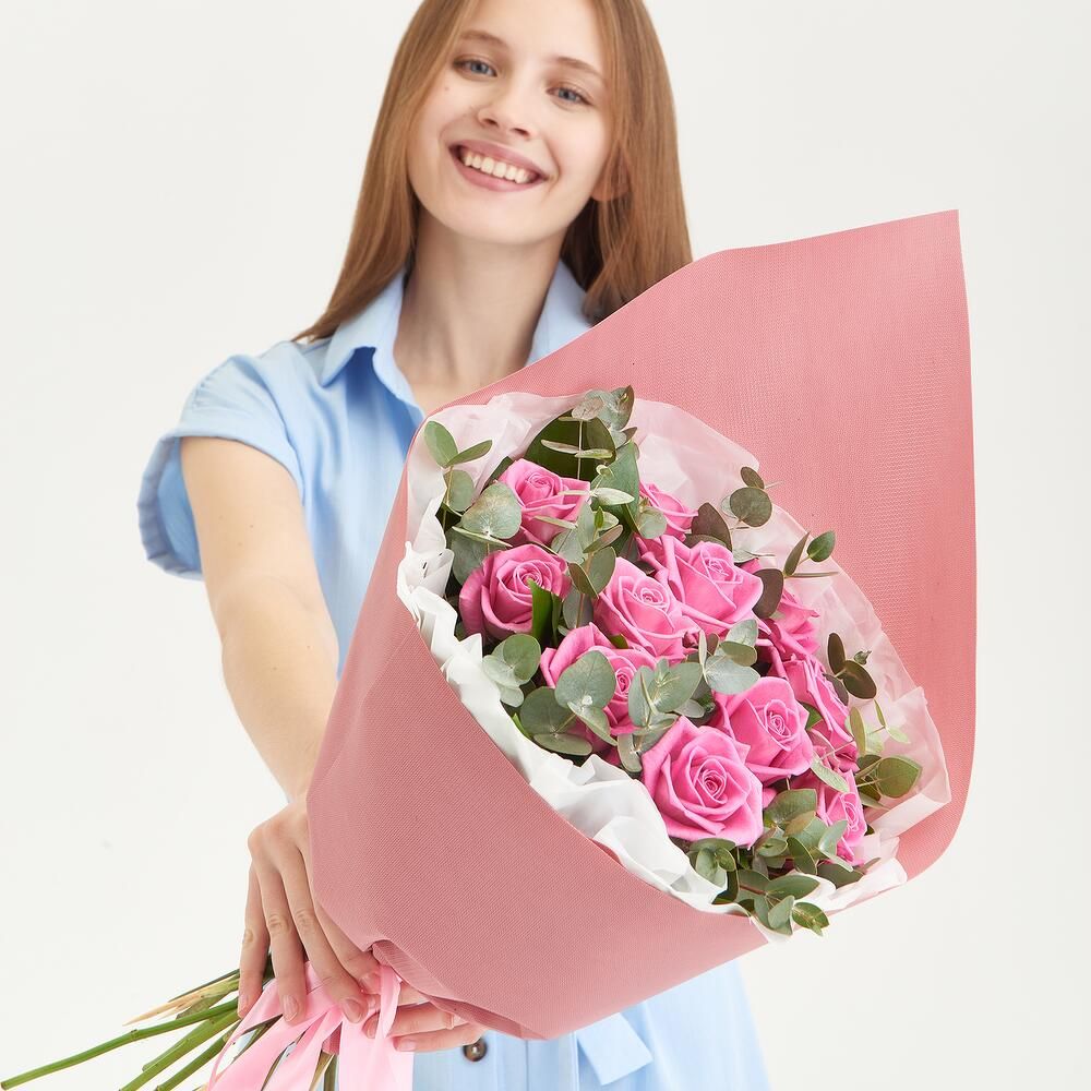 Состав: роза розовая 50 см - 11 шт, эвкалипт, крафт, лента - 1 шт.