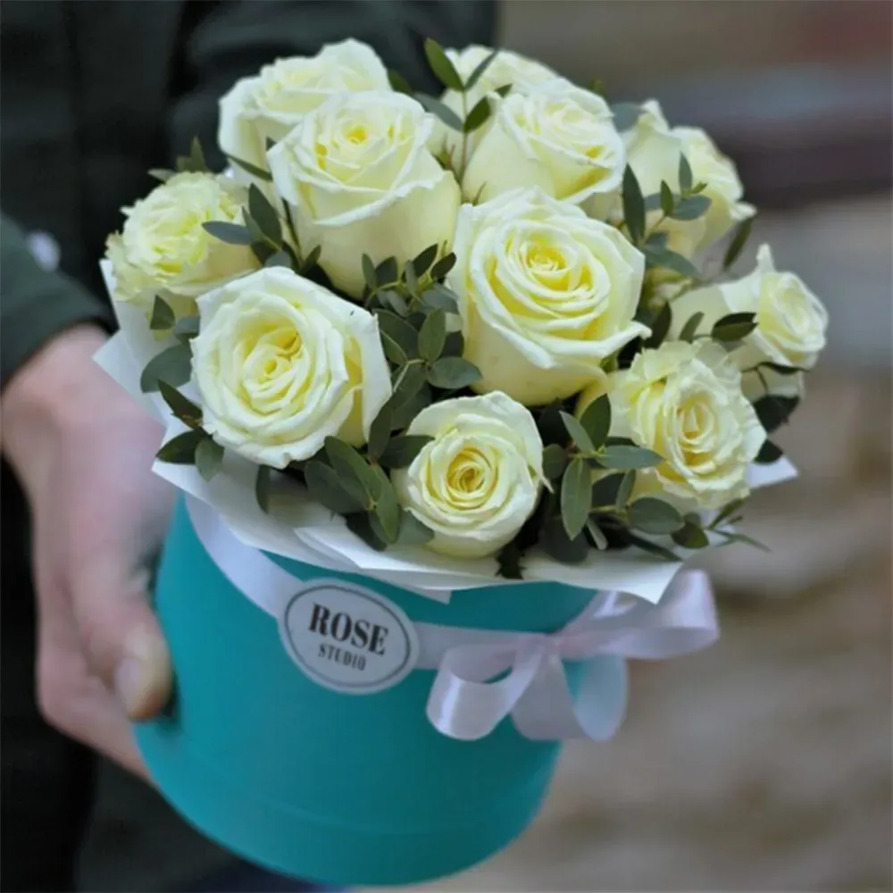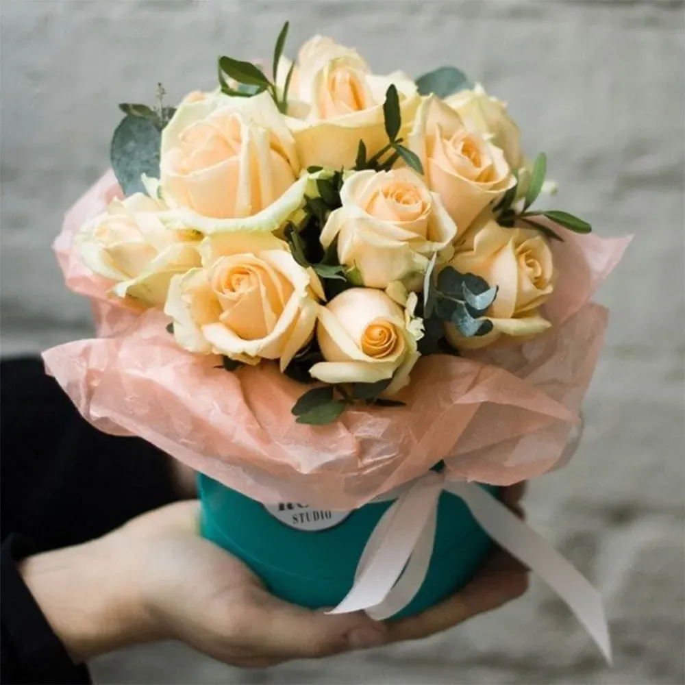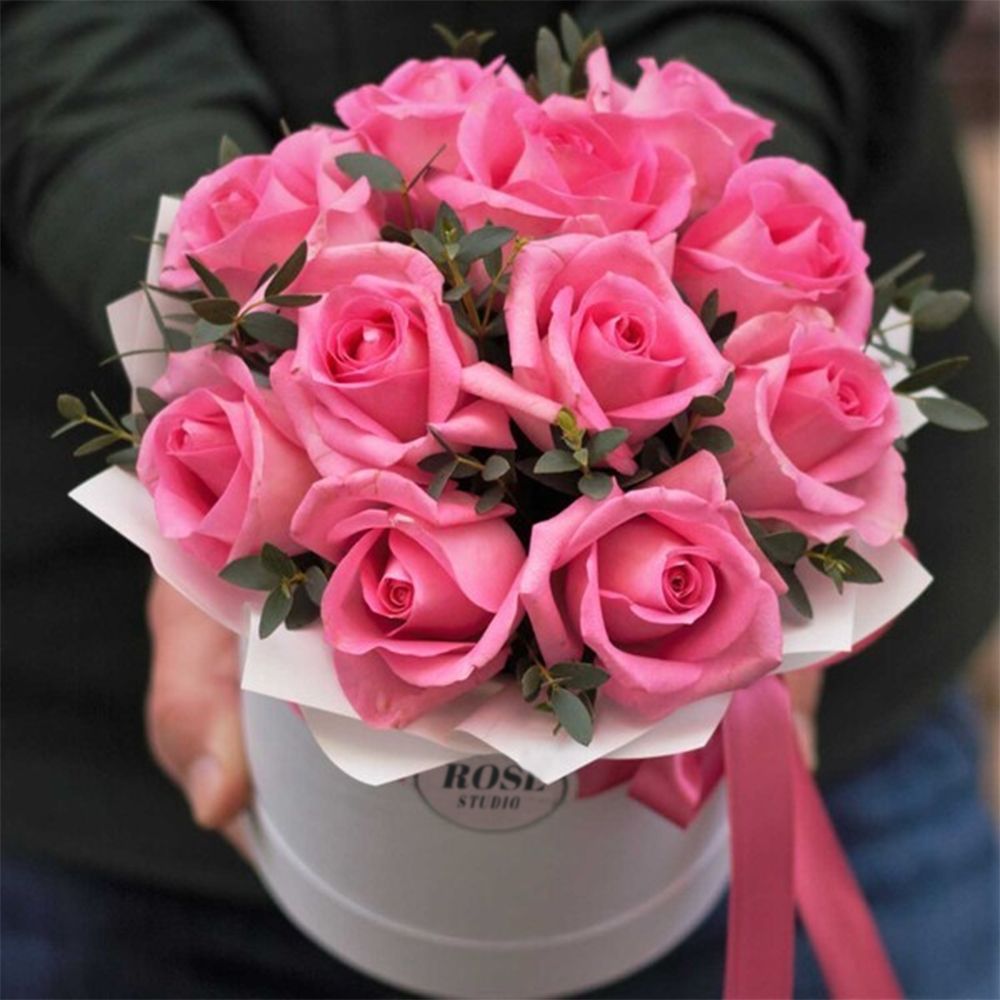 Состав: роза розовая 50 см - 11 шт, шляпная коробка - 1 шт - 1 шт, эвкалипт - 1 шт - 1 шт, лента атласная - 1 шт - 1 шт, флористическая губка - 1 шт. Ширина - 1 шт, высота - 18 шт. -