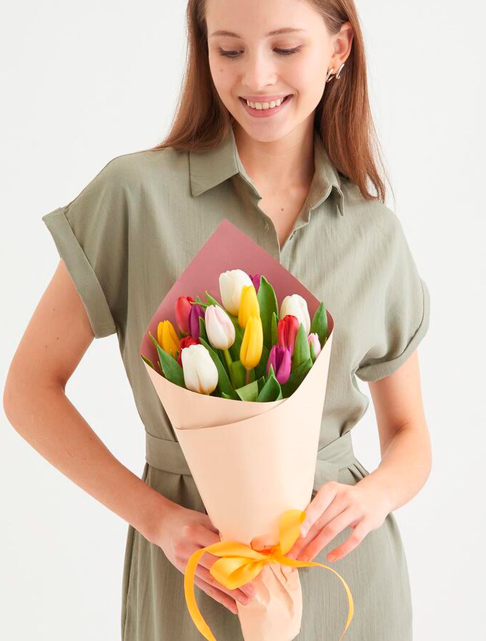 ТипбукетВид цветовтюльпанВысота60 смДиаметр25 смЦветМикс