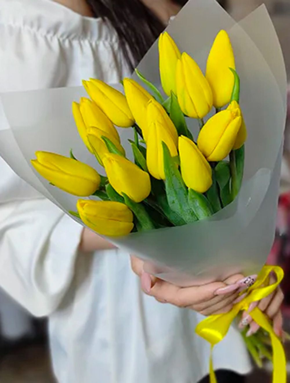 Состав: тюльпан желтый - 15 шт - 15 шт, упаковка - 1 шт, лента - 1 шт.