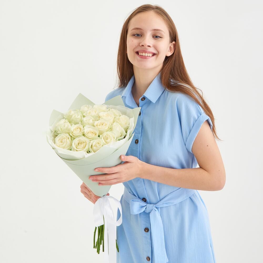 Состав: роза белая 50 см - 19 шт, крафт, лента - 1 шт.