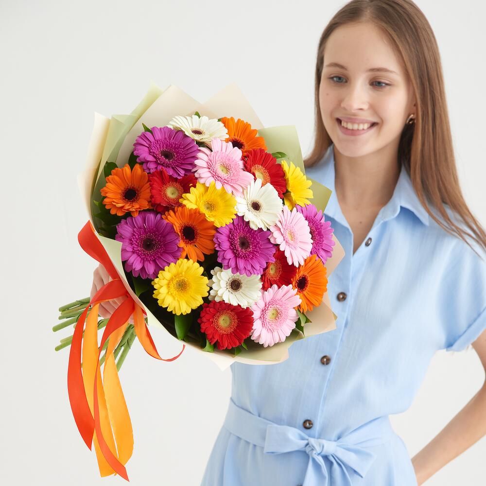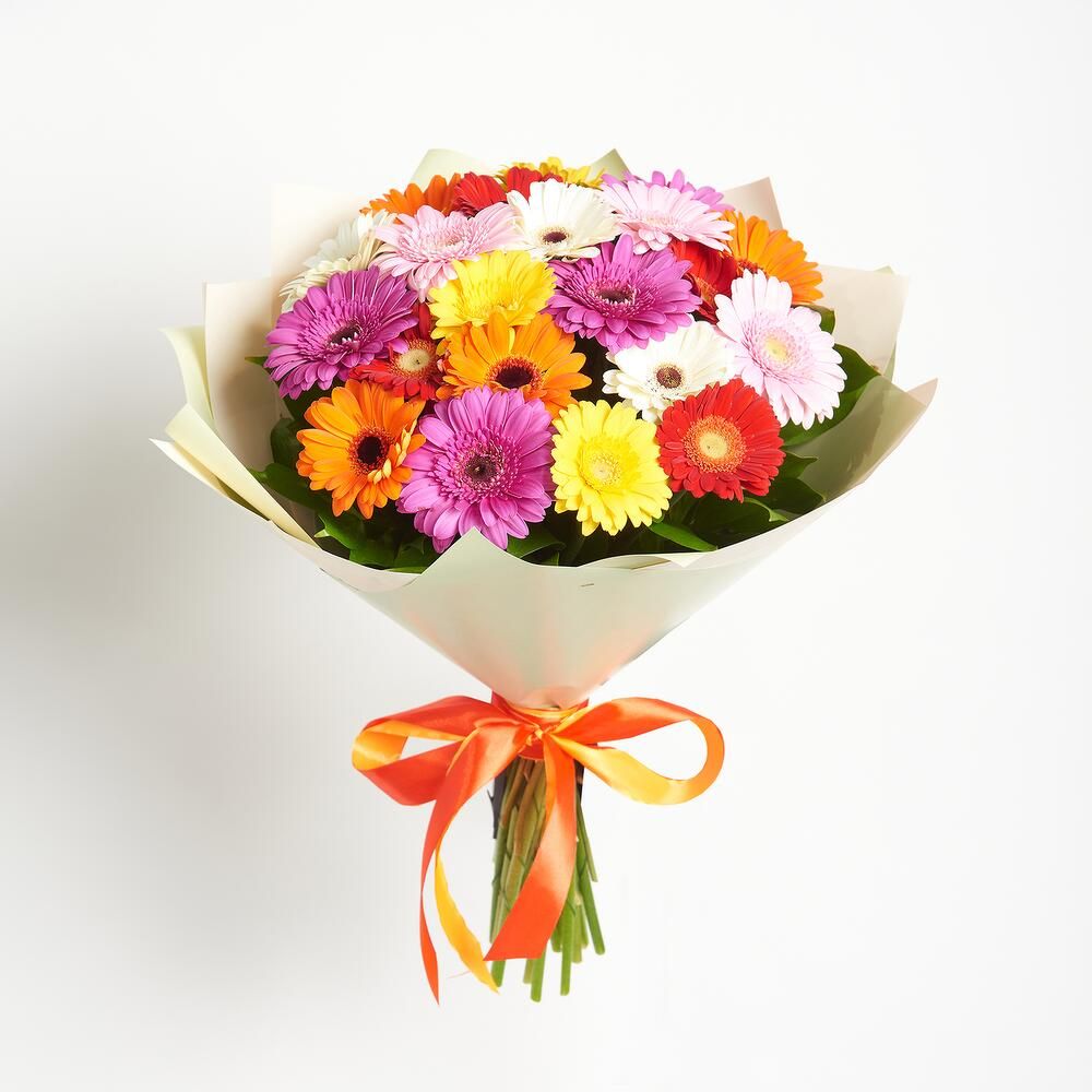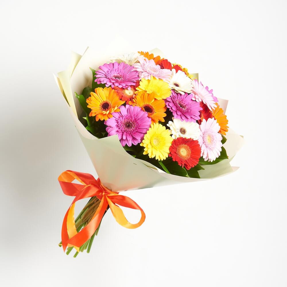 Состав: гербера мини - 21 шт - 21 шт, крафт, лента - 1 шт.