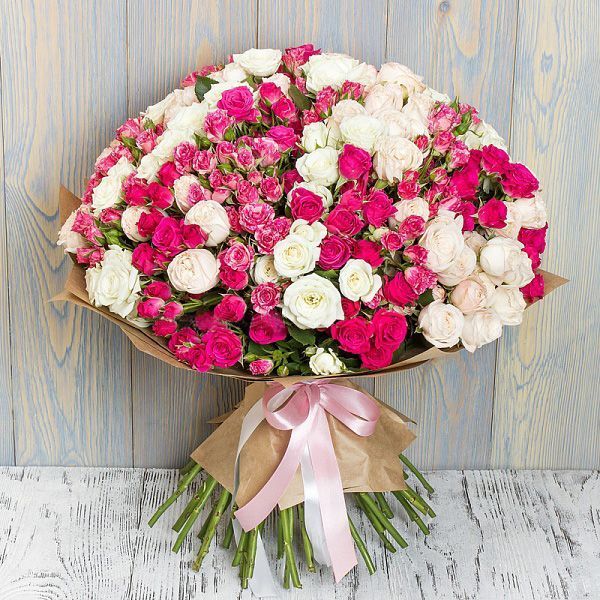 Состав: роза розовая белая кустовая 50 см - 59 шт, упаковка крафт - 1 шт, лента Размеры: диаметр - 65 шт, длина - 50 шт.