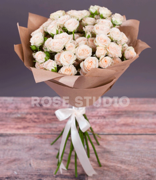 Состав: роза кустовая 50 см - 7 шт, упаковка крафт - 1 шт, лента кружевная Размеры: диаметр - 30 шт, длина - 50 шт.