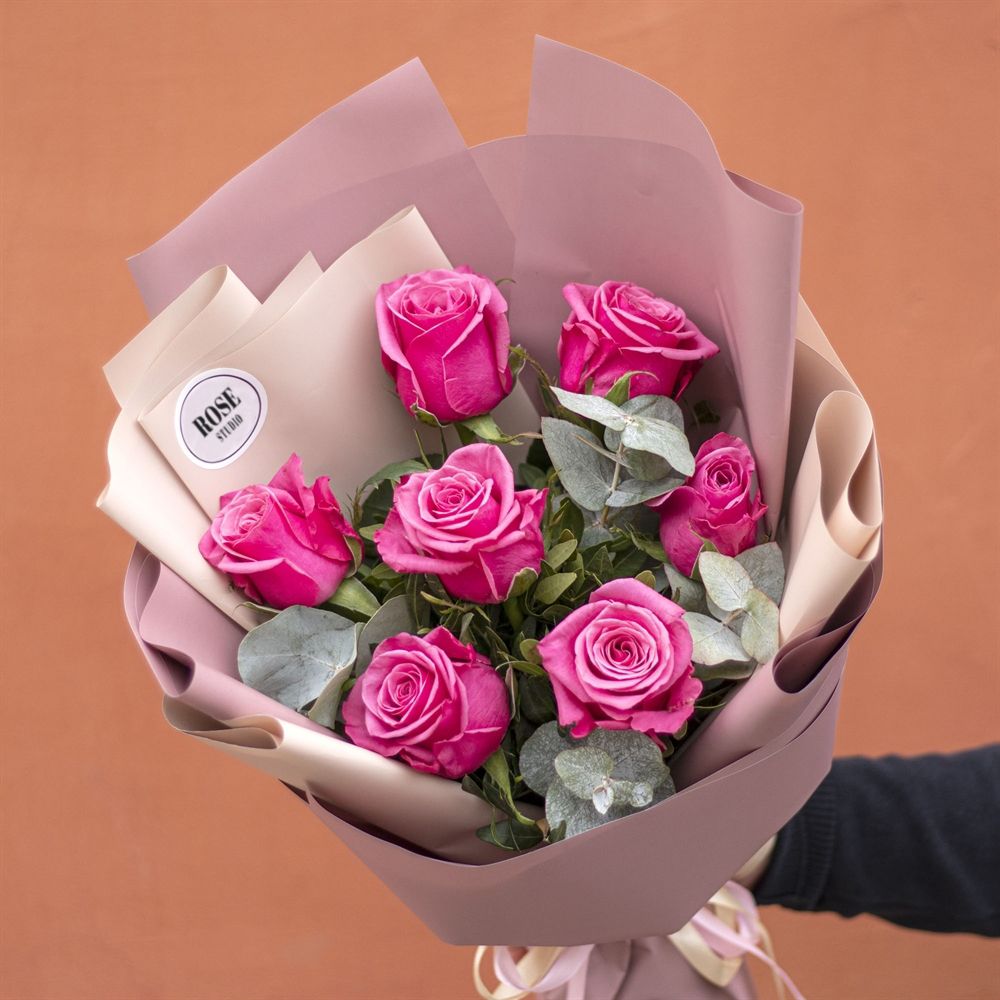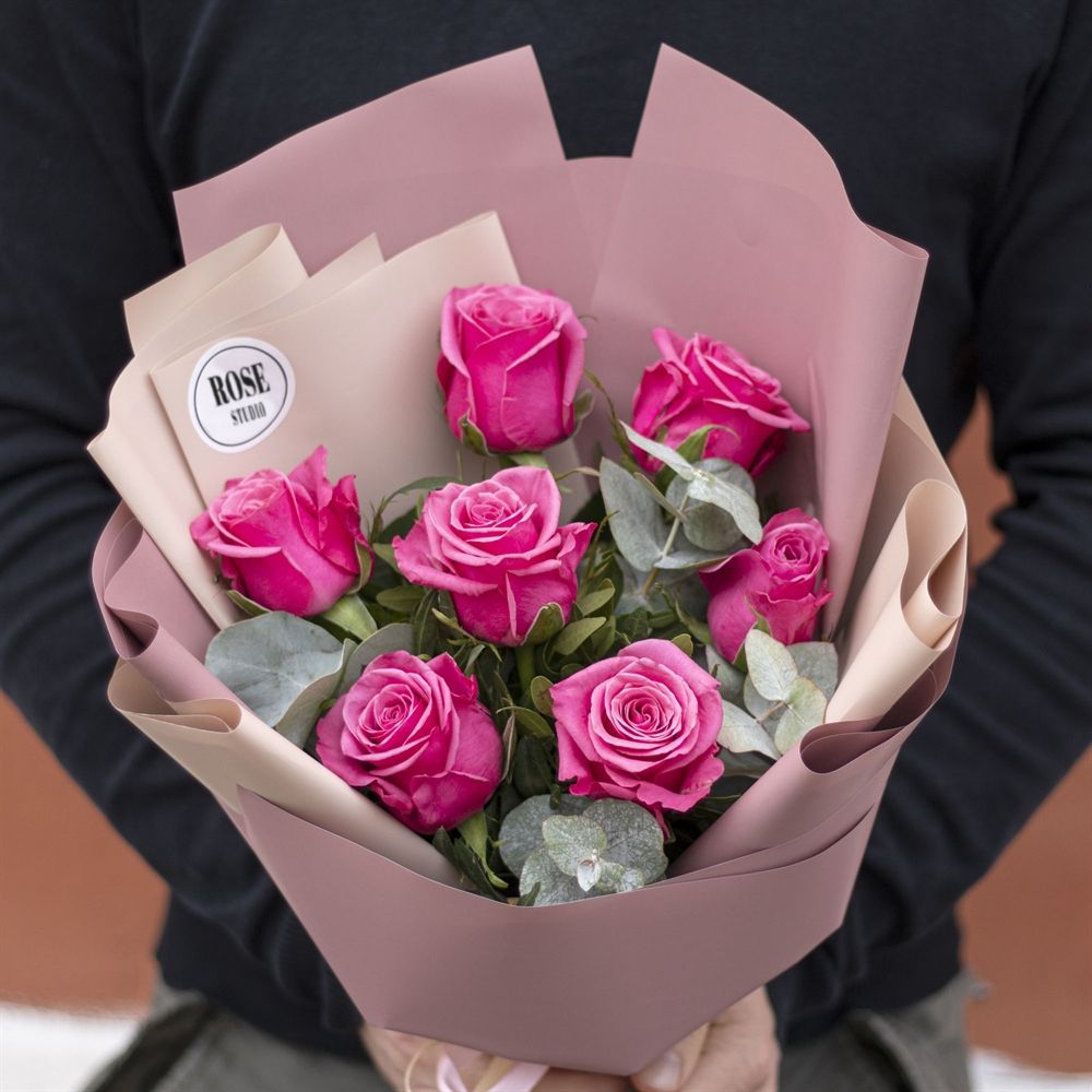 Состав: роза розовая 50 см - 7 шт, эвкалипт, упаковка матовая - 1 шт, лента атласная Ширина - 15 шт, высота - 40 шт.
