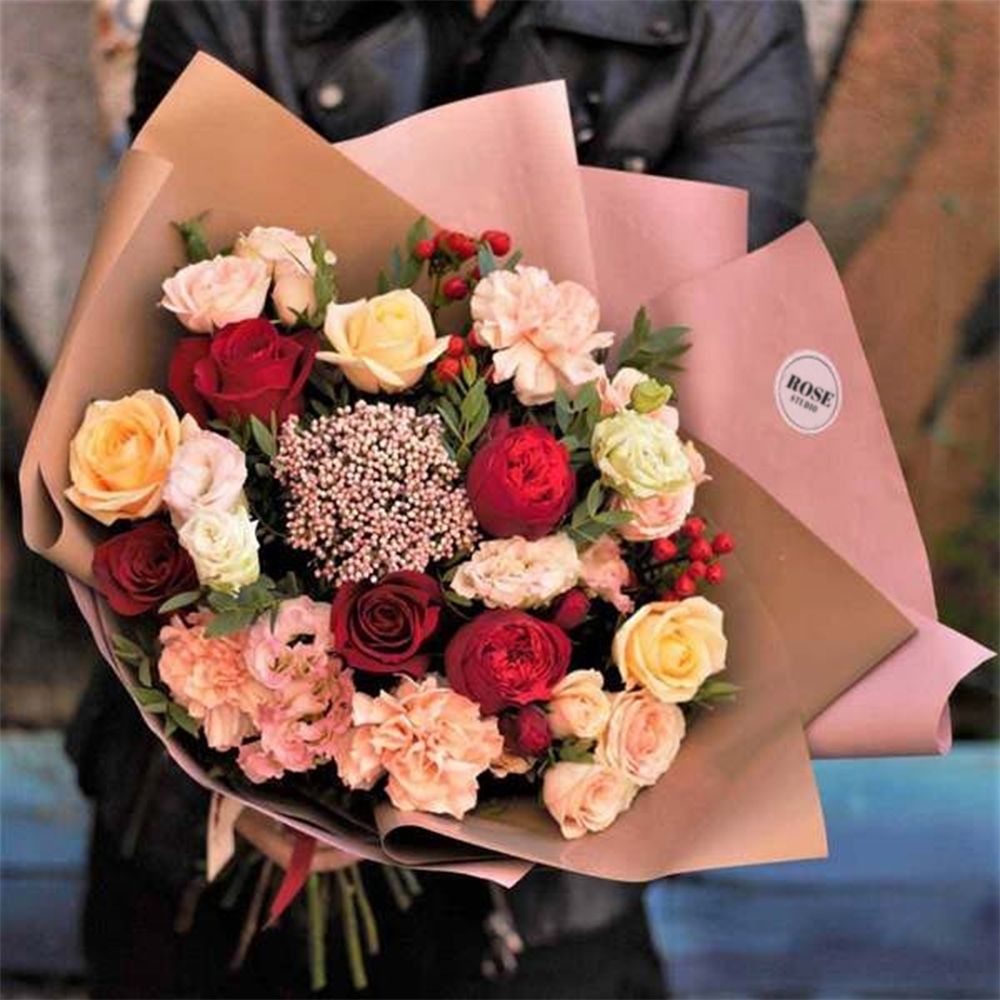 Состав: роза пионовидная 50 см - 2 шт, роза эквадор - 3 шт, роза персиковая одноголовая 50 см - 3 шт, роза кустовая 50 см - 3 шт, упаковка матовая корейская - 4шт - 4 шт, диантус персиковый - 3шт - 3 шт, эвкалипт - 3шт - 3 шт, лента атласная - 2шт - 2 шт, эустома розовая "алиса пинк" - 2шт - 2 шт, гиперикум красный - 2шт - 2 шт, фисташка - 1шт - 1 шт, озотамнус - 1шт. Ширина - 1 шт, высота - 45 шт.