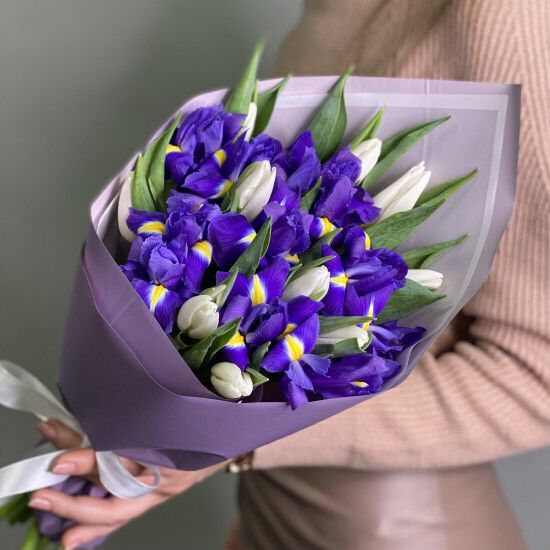 Состав: Ирисы - 9 шт - 9 шт, Тюльпаны - 9 шт - 9 шт, Оформление.