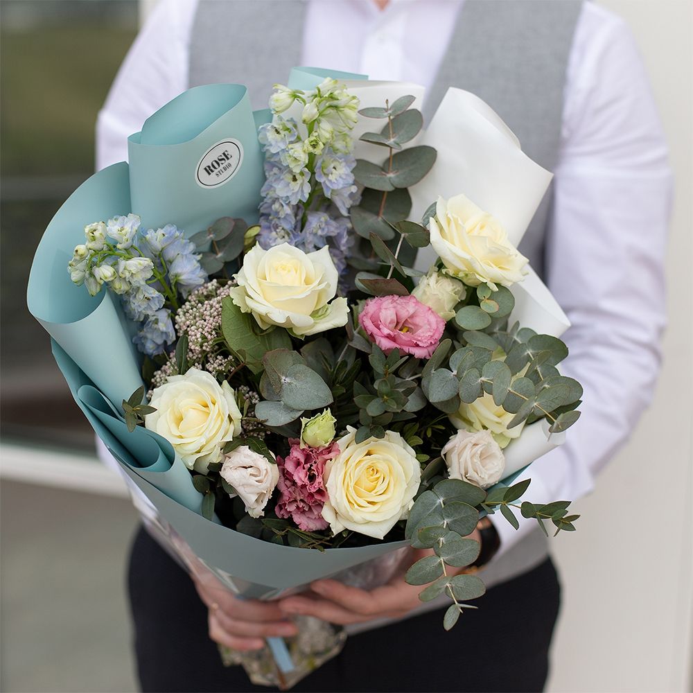 Состав: роза белая 50 см, 5 шт - 5 шт, дельфиниум &mdash, 2 шт - 2 шт, эустома розовая &mdash, 1 шт - 1 шт, озотамнус &mdash, 1 шт - 1 шт, эвкалипт, упаковка матовая - 1 шт.