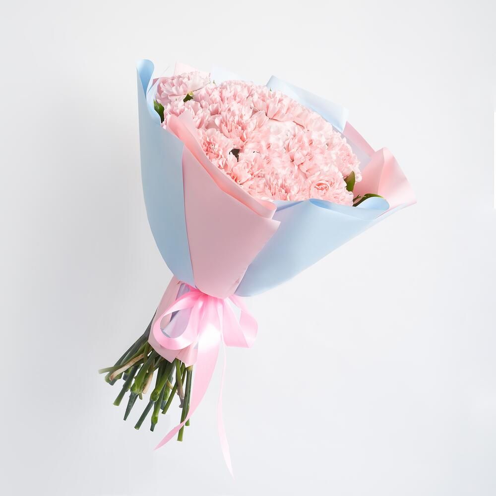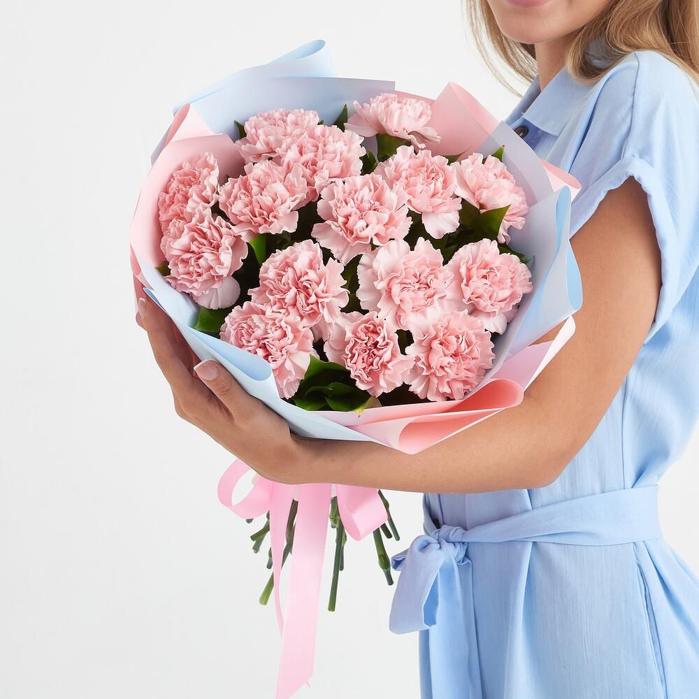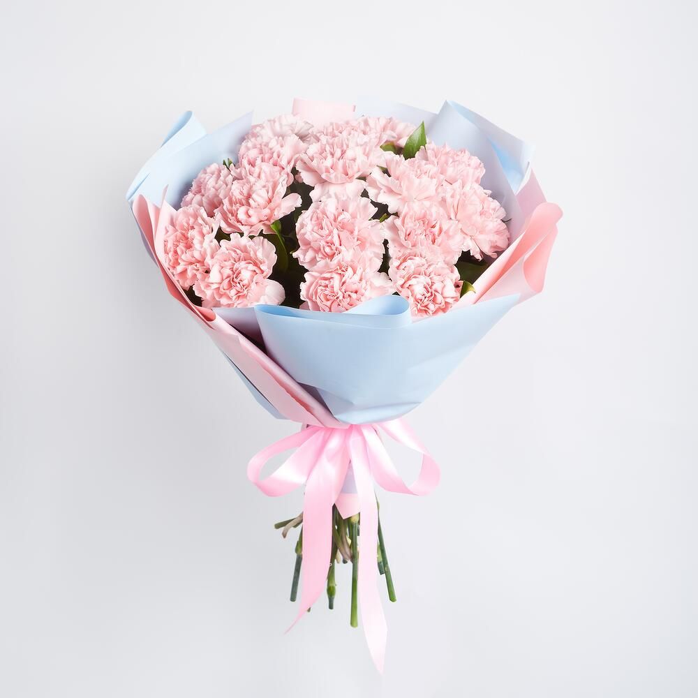 Состав: диантус розовый - 15 шт - 15 шт, пленка матовая, лента атласная. Ширина - 27 шт, высота - 40 шт.