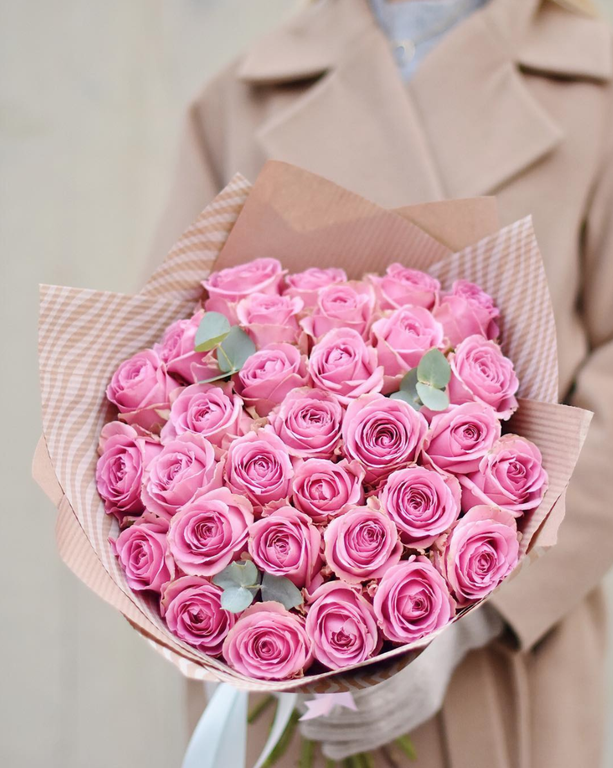 Состав: роза розовая одноголовая 50 см - 31 шт, эвкалипт, крафт, лента Размеры: Диаметр Длина - 1 шт.
