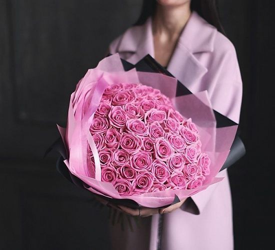 Состав: роза розовая одноголовая 50 см - 51 шт, упаковка крафт - 1 шт, лента Размеры: диаметр - 45 шт, длина - 50 шт.