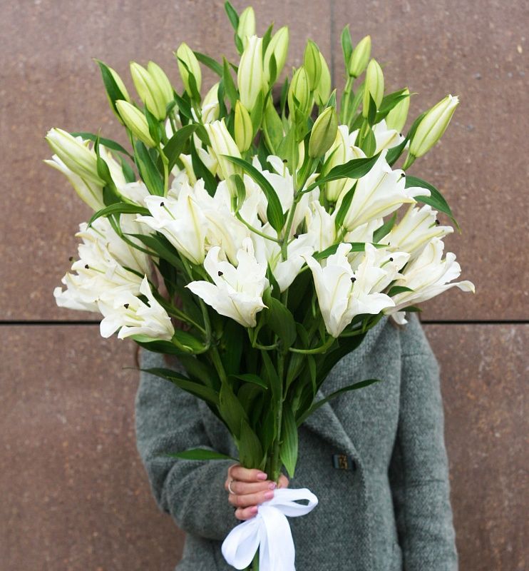 Состав: лилия - количество на выбор (на фото 15 шт.) - 15 шт, лента Данный букет - 1 шт, желательно заказывать за 24 часа, чтобы цветки были раскрыты как на фотографии. -