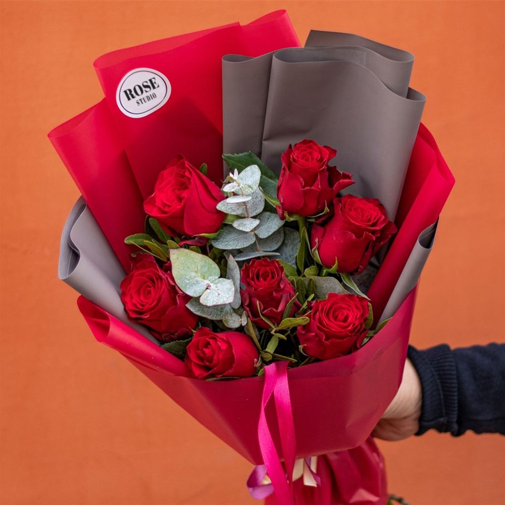 Состав: роза красная 50 см - 7 шт, эвкалипт, упаковка матовая - 1 шт, лента атласная. Ширина - 16 шт, высота - 45 шт.