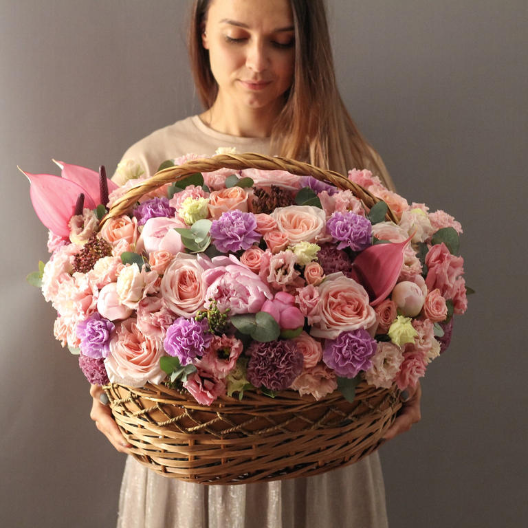 Состав: роза 50 см, роза 50 см, пионами, сиреневыми диантусами, эустомой, веточками эвкалипта и антуриумами. Нежная и ароматная композиция для романтичных натур и особенных дат.