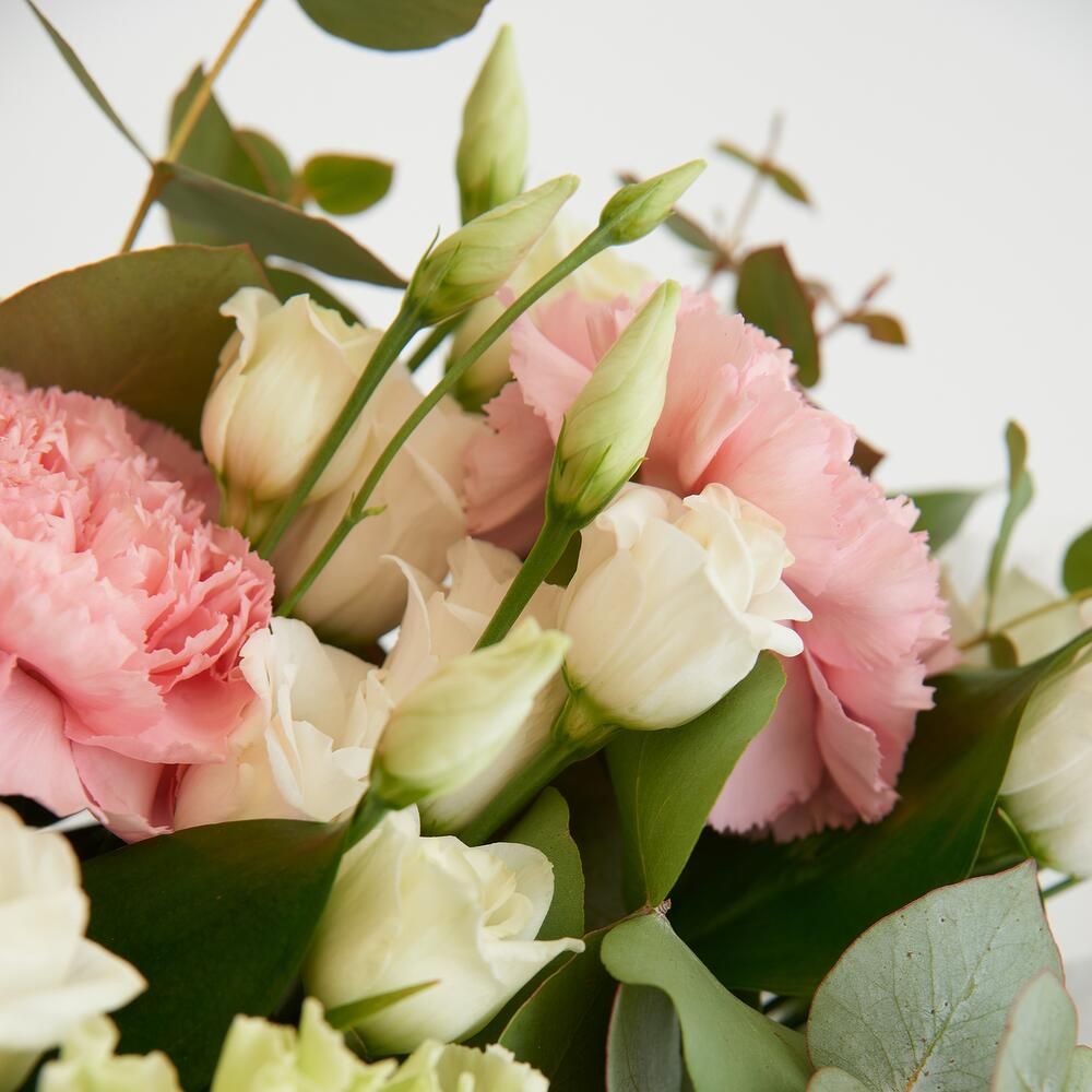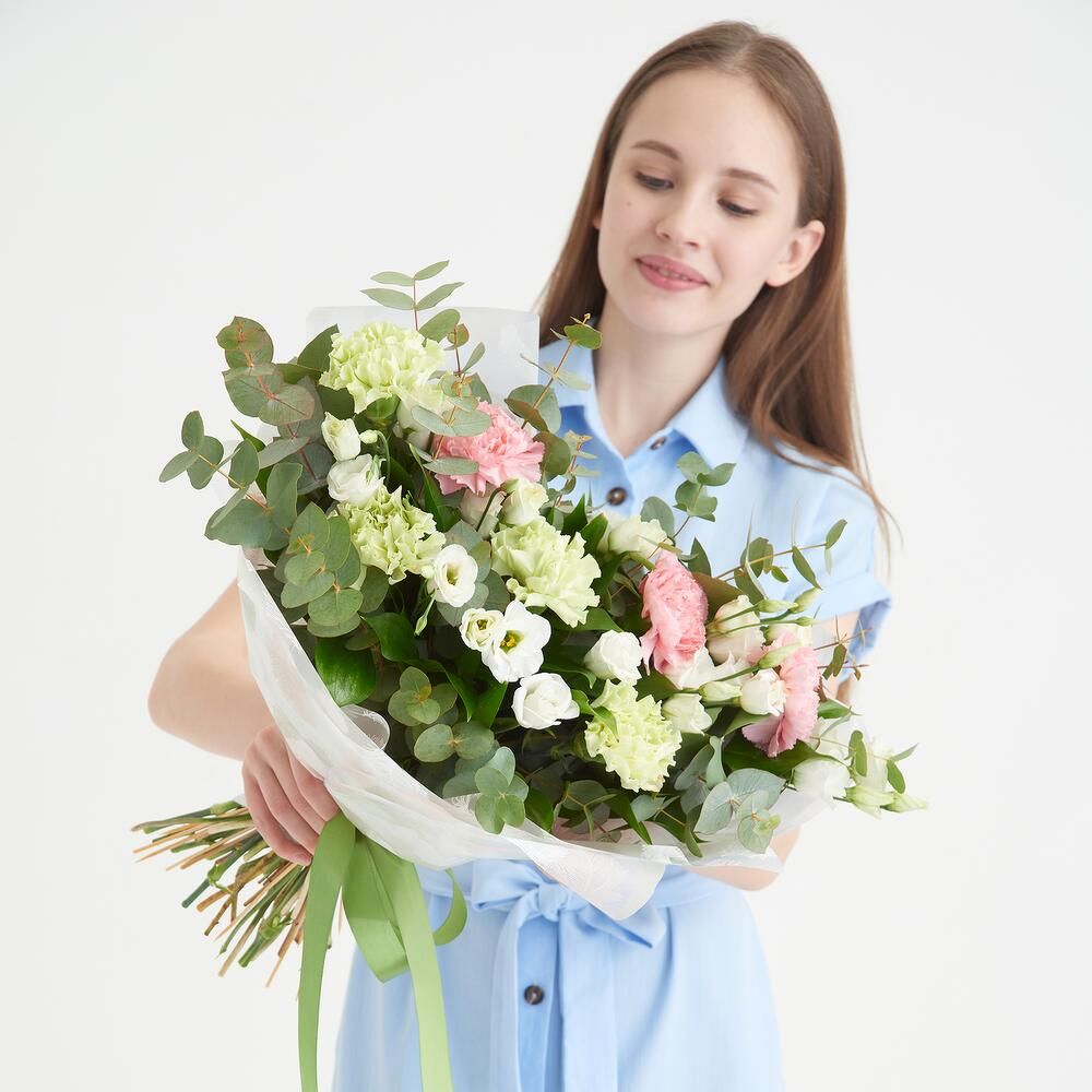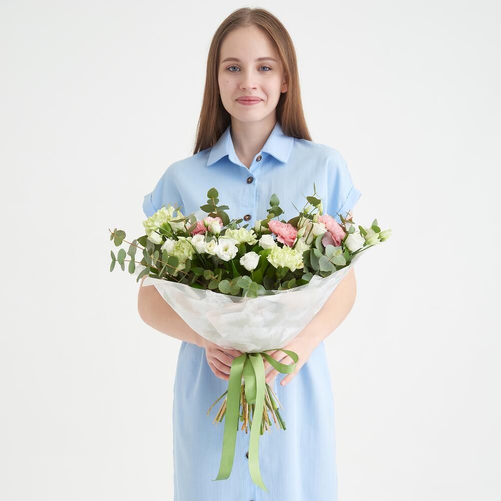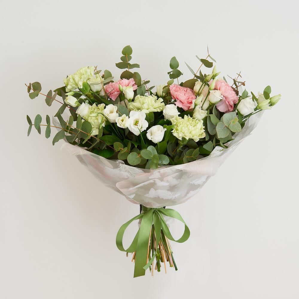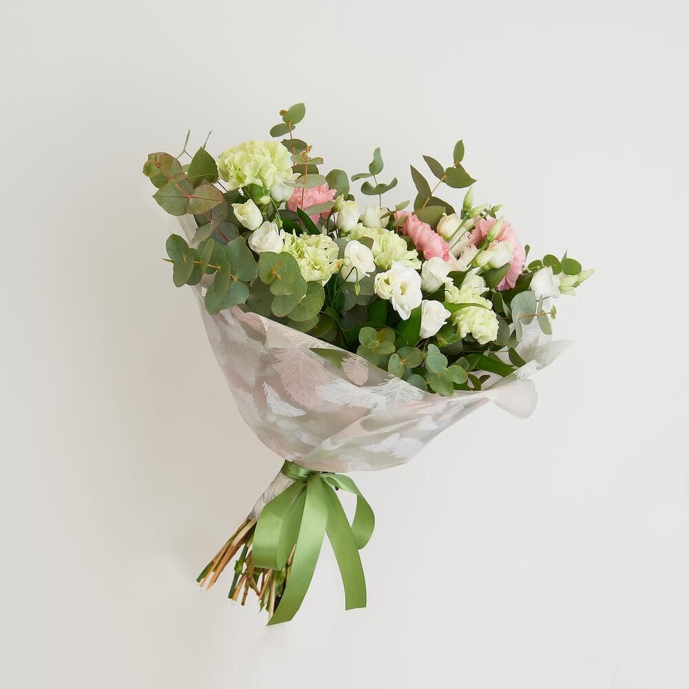 Состав: диантус зеленый и розовый - 7 шт - 7 шт, эустома - 3 шт - 3 шт, эвкалипт, зелень, пленка, лента - 1 шт.