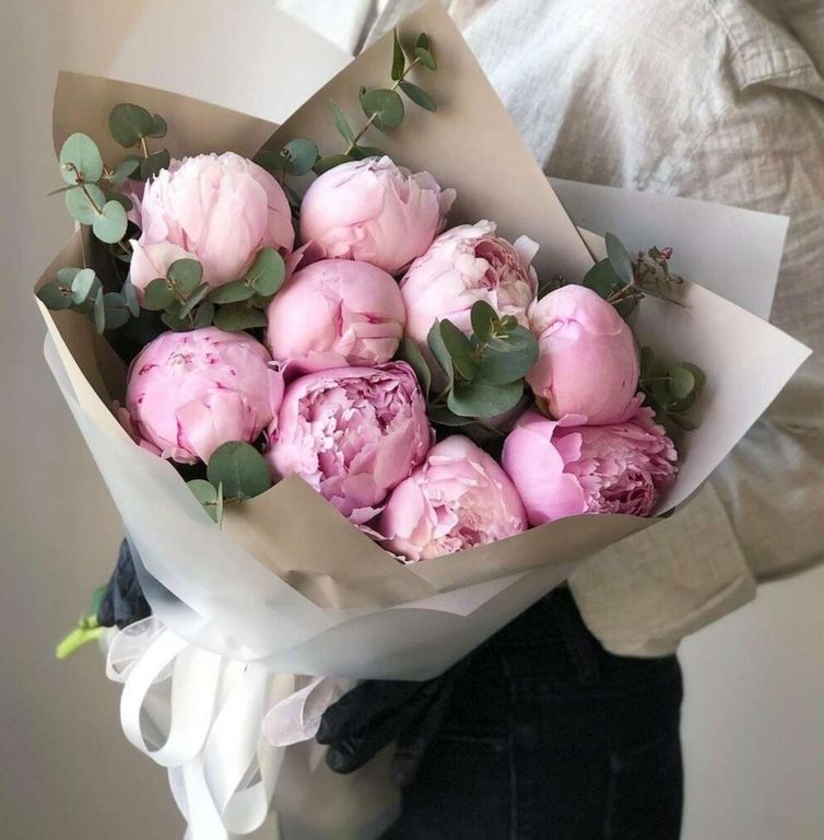 Состав: Пионы импорт - 9 шт - 9 шт, Зелень, Оформление.