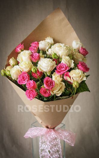 Состав: роза кустовая 50 см - 5 шт, упаковка крафт - 1 шт, лента кружевная Размеры: диаметр - 20 шт, длина - 80 шт.