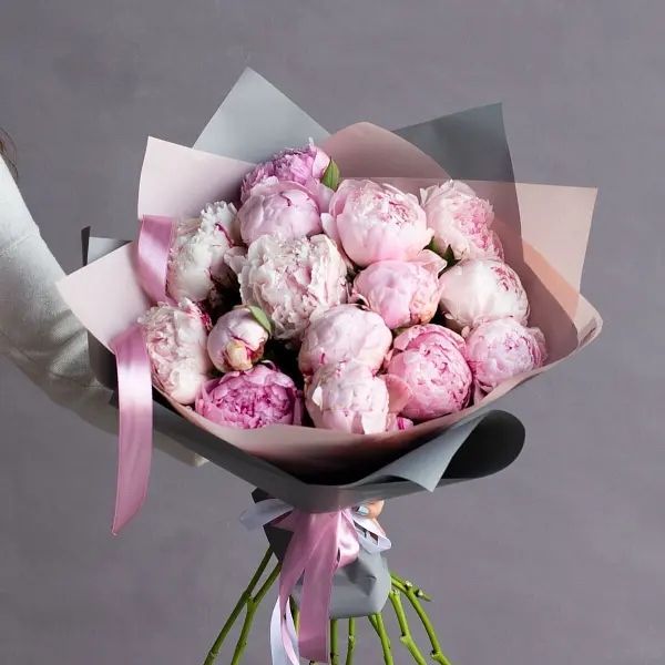 Состав: Пионы - 15 шт - 15 шт, дизайнерское оформление, лента - 1 шт.