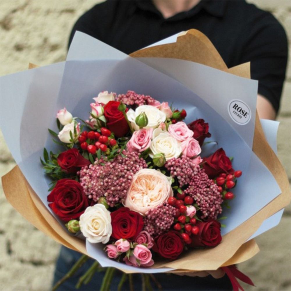 Состав: роза 50 см, роза кустовая 50 см - 3 шт, роза пионовидная 50 см - 2 шт, 9шт. диантус &mdash - 9 шт, 3шт. гиперикум &mdash - 3 шт, 2шт. озотамнус &mdash - 2 шт, 1шт. Ширина - 1 шт, dысота - 40 шт.