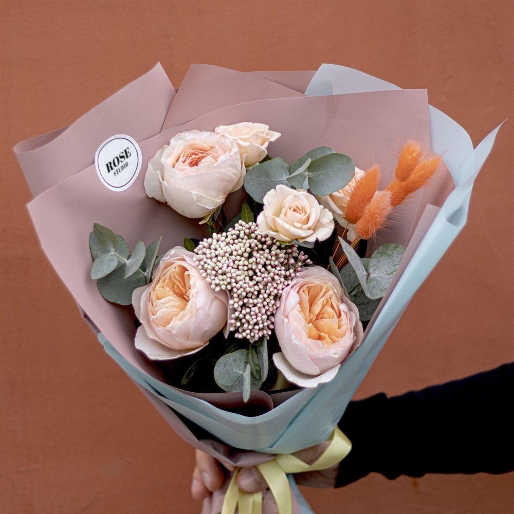 Состав: роза пионовидная 50 см - 3 шт, роза кустовая 50 см - 1 шт, лагурус - 4 шт - 4 шт, озотамнус, эвкалипт, упаковка матовая - 1 шт, лента атласная Ширина - 20 шт, высота - 40 шт.