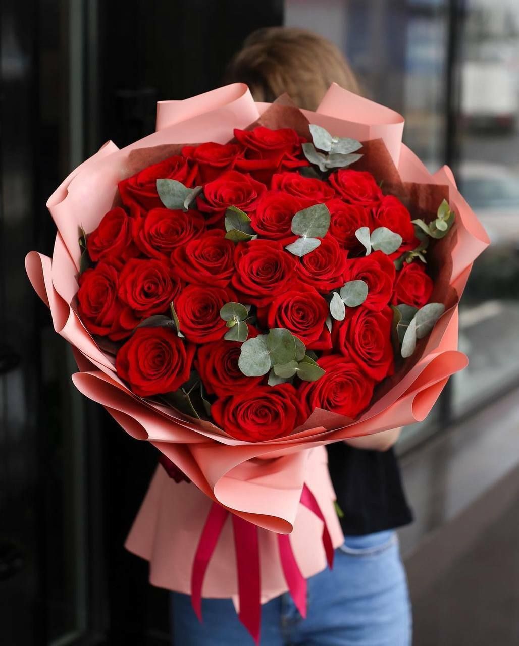 Букет "Поцелуй" из 31 красной розы с эквалиптом