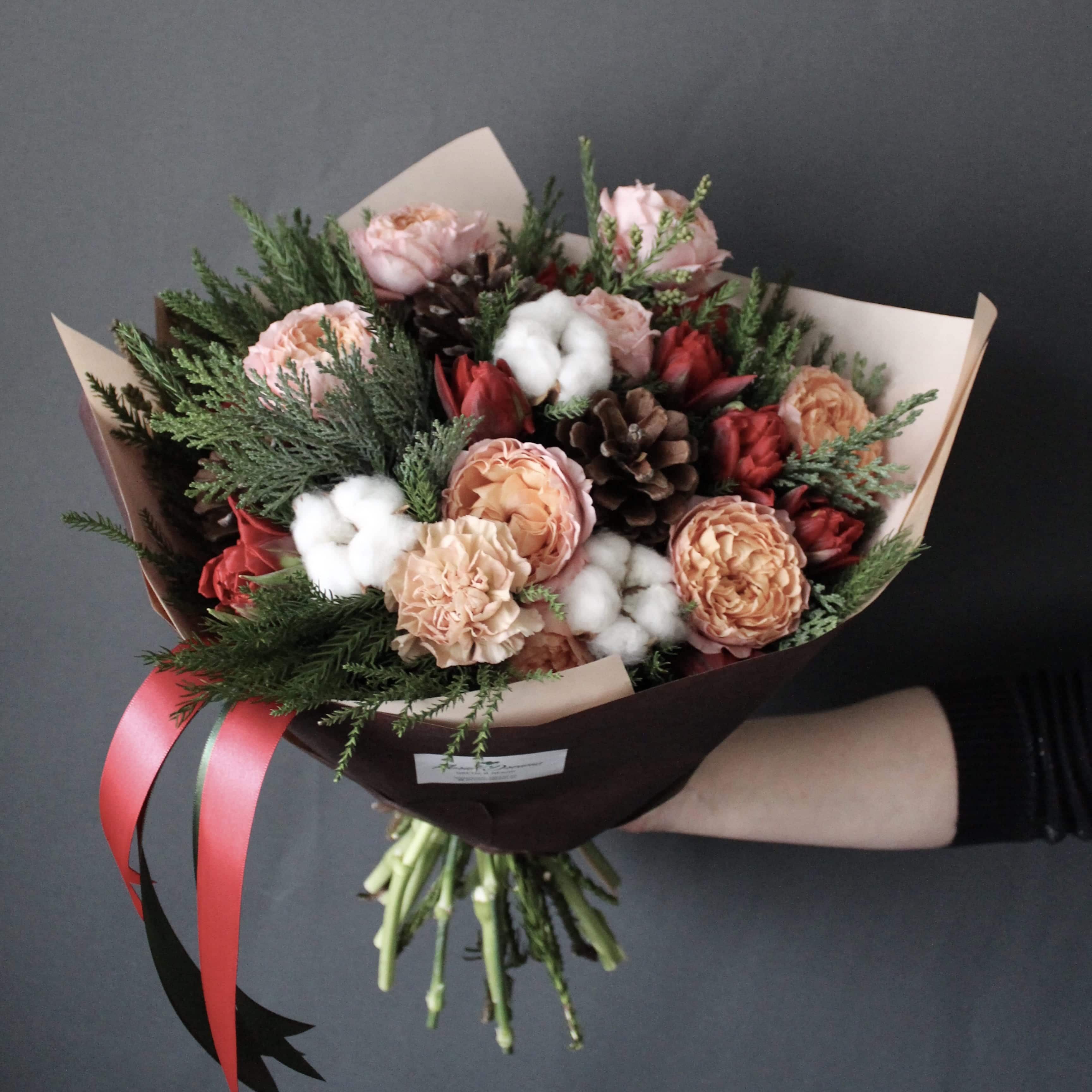 Состав: роза пионовидная 50 см - 5 шт, тюльпан - 7 шт - 7 шт, хлопок - 4 шт - 4 шт, диантус - 4 шт - 4 шт, шишка - 3 шт - 3 шт, нобилис (может быть заменена на подобный декор - 1 шт, по согласованию с Вами), упаковка - 1 шт, лента На данный товар заказ принимается минимум за сутки Размеры: высота - 50 шт, диаметр - 30 - 30 шт.