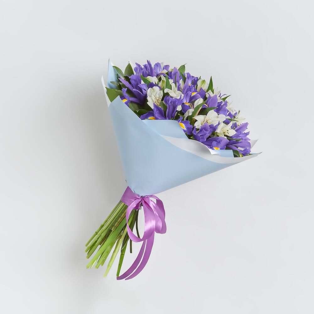 Состав: ирис - 12 шт - 12 шт, альстромерия белая - 5 шт - 5 шт, зелень, крафт, лента - 1 шт.