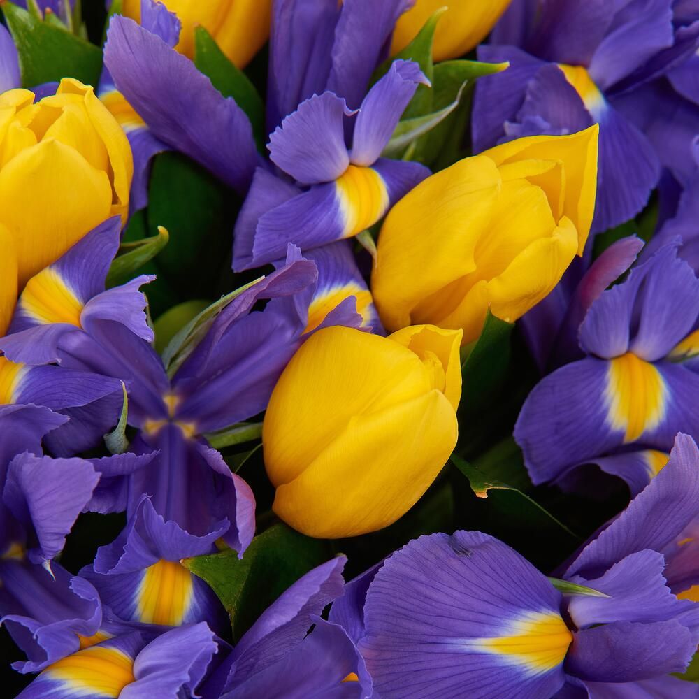 Состав: тюльпан желтый - 13 шт - 13 шт, ирис - 12 шт - 12 шт, салал, оформление, лента - 1 шт.