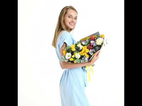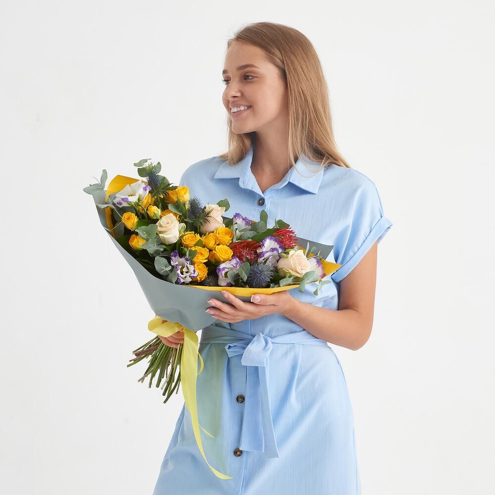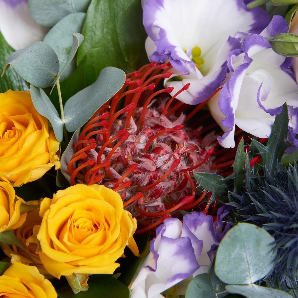 Состав: роза кустовая 50 см - 2 шт, роза 50 см - 3 шт, протея - 2 шт - 2 шт, эустома - 4 шт - 4 шт, эвкалипт, эрингиум, пленка, лента - 1 шт.