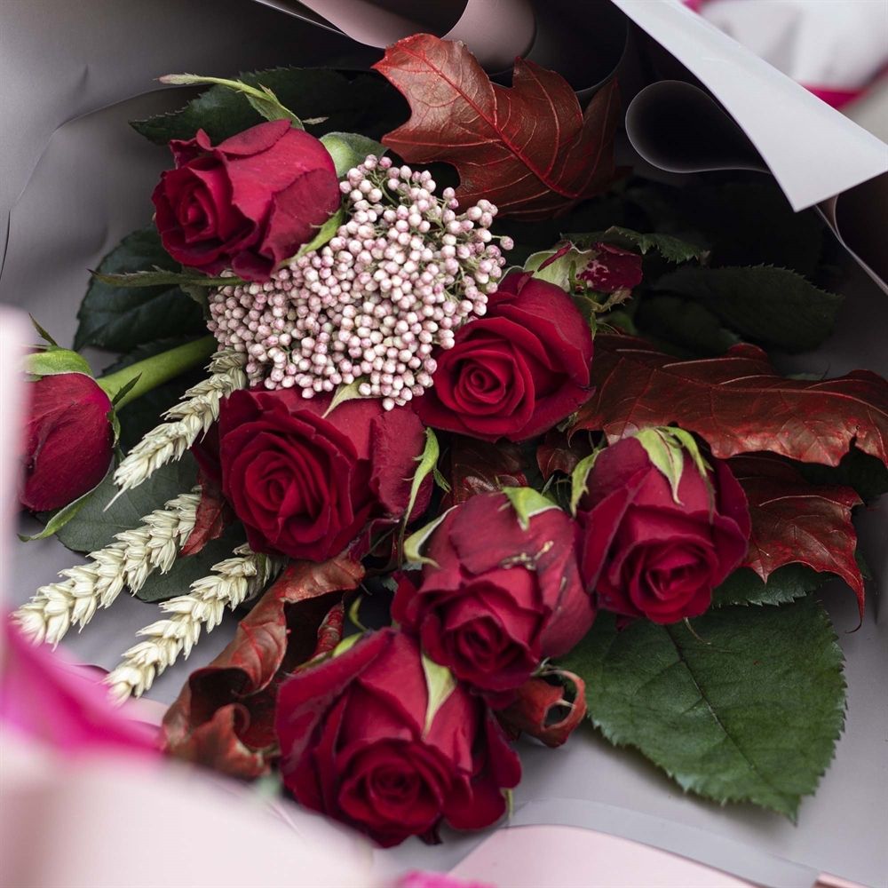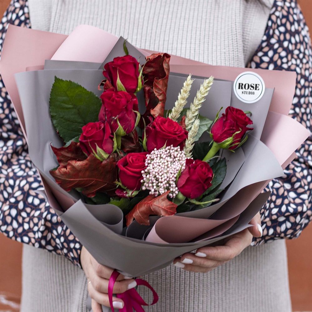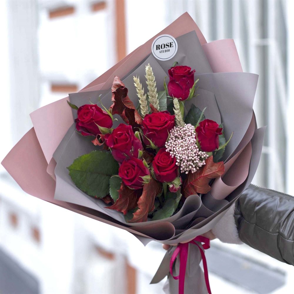 Состав: роза красная 50 см - 7 шт, колосья пшеницы - 3 - 3 шт, озотамнус - 1 - 1 шт, листья дуба - 1 - 1 шт, упаковка матовая - 1 шт, лента атласная Ширина - 20 шт, высота - 45 шт.