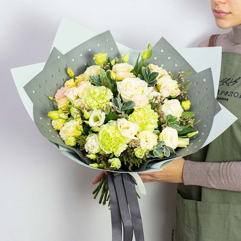 Состав: роза белая 50 см - 5 шт, роза кустовая 50 см - 2 шт, лагурус зеленый - 3 шт - 3 шт, эустома сливочная - 10 шт - 10 шт, сафари микс - 2 шт - 2 шт, питтоспорум - 5 шт - 5 шт, рускус - 10 шт - 10 шт.