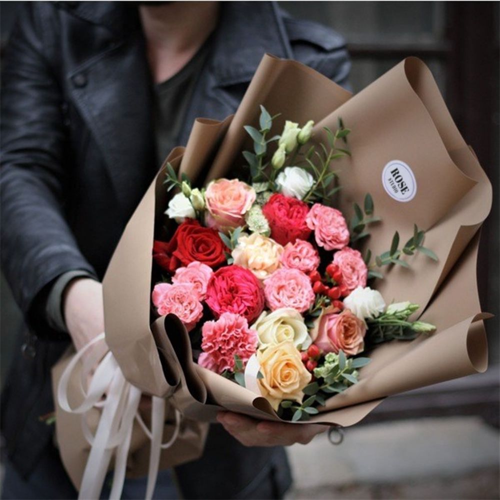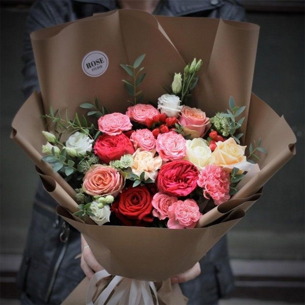 Состав: роза пионовидная 50 см - 2 шт, роза персиковая пионовидная кустовая 50 см - 2 шт, роза пионовидная 50 см - 2 шт, роза красная 50 см - 1 шт, эвкалипт - 3шт - 3 шт, упаковка матовая "шоколад" - 3шт - 3 шт, эустома белая - 1шт - 1 шт, лента атласная - 1шт - 1 шт, гвоздика розовая - 1шт - 1 шт, астранция Биллион Стар - 1шт - 1 шт, гиперикум красный - 1шт. Ширина - 1 шт, высота - 40 шт.