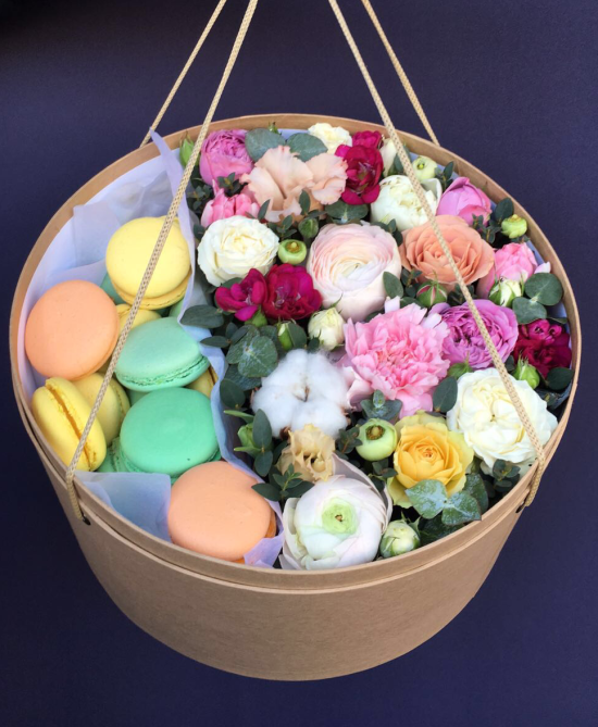 Состав: роза 50 см, Пирожное макаруны - 10 шт. (на фото) - 10 шт, Коробка, Ранункулюс, гвоздика, хлопок, луговые цветы, зелень, Декор Размеры: Диаметр (как на фото), Высота.