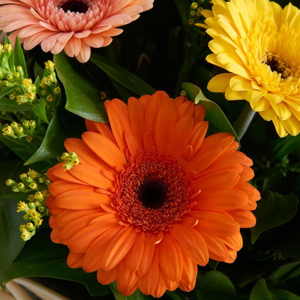 Состав: гербера - 25 шт - 25 шт, солидаго - 5 шт - 5 шт, зелень, корзина - 1 шт.