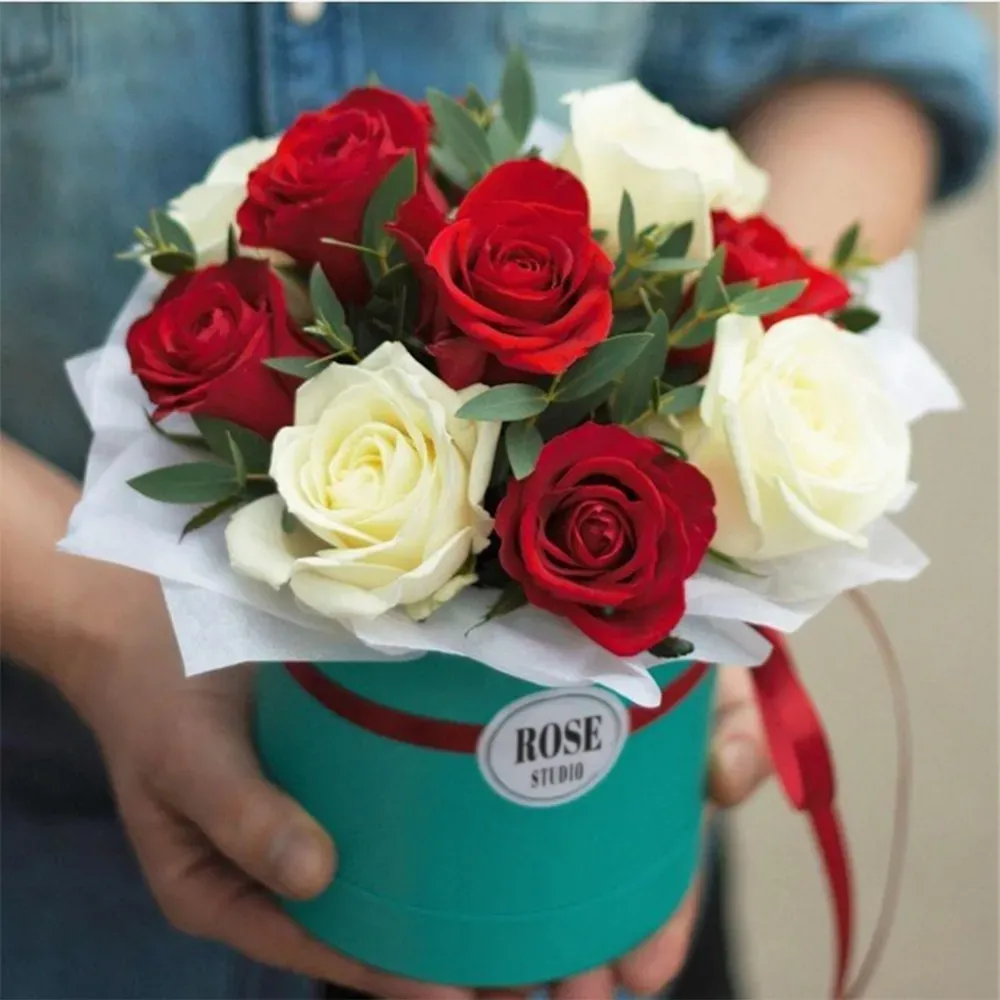 Состав: роза белая 50 см - 5 шт, роза красная 50 см - 6 шт, зелень - 1 шт - 1 шт, шляпная коробочка - 1 шт.