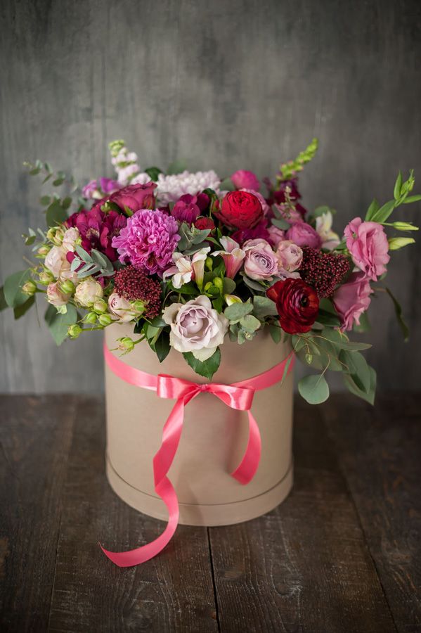 Состав: пионовидные кустовые розы разных сортов, одноголовые розы малиновых оттенков, гортензия, пионы, эустома, диантусы, барбадос, львиный зев и маттиола, оформлен эвкалиптом Размеры: Диаметр (как на фото), Длина При заказе композиции на другие суммы состав и кол - во цветка будет изменено пропорционально стоимости, при этом стилистика и цветовое решение не изменится. Если при заказе в наличии не оказалось полностью идентичного цветка, входящего в состав выбранного Вами букета, мы оставляем за собой право подобрать наиболее близкий к исходному вариант цветка из наличия. При этом цветовая гамма и стилистика букета будут сохранены. Готовый букет может отличаться от представленного на фотографии. Выбор цвета коробки производится нами самостоятельно под стиль и настроение цветочной композиции. Если у Вас есть определенные предпочтения - 1 шт, просьба писать в комментариях к заказу.