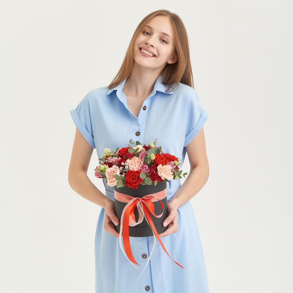 Состав: роза красная кустовая 50 см - 3 шт, роза 50 см - 7 шт, эустома розовая - 3 шт - 3 шт, диантус кремовый - 6 шт - 6 шт, бруния - 2 шт - 2 шт, эвкалипт - 5 шт - 5 шт, коробка - 1 шт, лента - 1 шт.