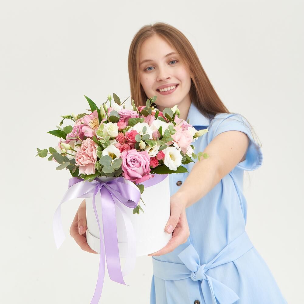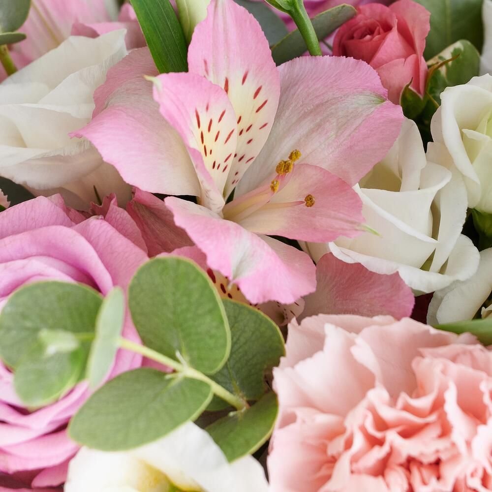 Состав: роза кустовая 50 см - 3 шт, роза 50 см - 5 шт, альстромерия розовая - 2 шт - 2 шт, диантус розовый - 4 шт - 4 шт, эустома - 2 шт - 2 шт, эвкалипт, питтоспорум, коробка - 1 шт, лента - 1 шт.