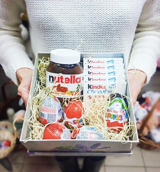 Состав: яйца kinder - сюрприз - 5 шт - 5 шт, kinder chocolate 5 шт - 5 шт, шоколадная паста Nutella - 200 г - 200 шт, коробка подарочная маленькая - 1 шт.