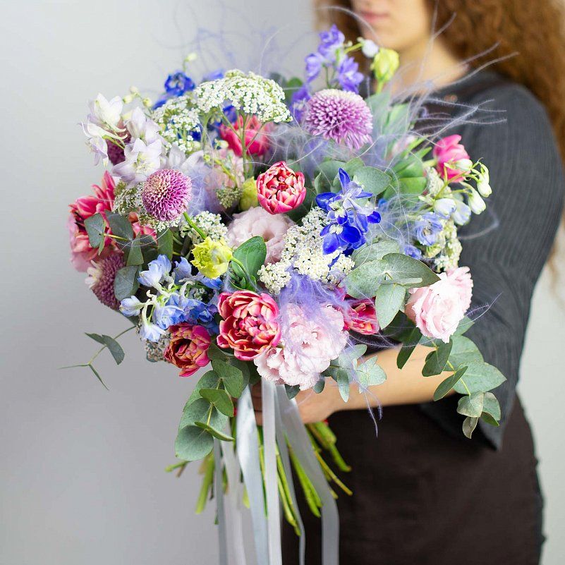 Состав: тюльпан пионовидный - 13 шт - 13 шт, дельфиниум - 6 шт - 6 шт, эустома - 10 шт - 10 шт, хризантема - 6 шт - 6 шт, ковыль - 6 шт - 6 шт, тысячелистник - 10 шт - 10 шт, эвкалипт - 10 шт - 10 шт, лента атласная - 2 шт - 2 шт.